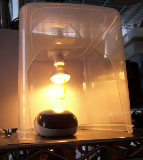 で考えたのが下のような装置。これをマウスにかぶせたら快適なんではないかということ。ただし、電球をそのまま AC100Vにつないだのでは熱も明るさもかなり強くなるだろうという目論見で、100V 20Wくらいの電球を半分以下の電力で使うことで光よりも遠赤外を多くして効率的に手を温めようという魂胆。