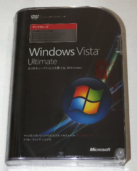 さて、ハードウェアの工作を終わって、いよいよ次は本来の目的の Vistaインストールです。 普通の人は Vista搭載(プリインストール)PCを買ってしまうので、Vistaがどんなパッケージで販売されているか知らないと思います。或いは Vistaにはどんな種類があるのかも気にしないと思います。Windows XPにも実は当初の Windows XP Professinal と Home Edition に加えて、いつの間にか Media Center / Tablet PC / Professional x64 Edition という3つの派生ができました。 ![]() 左の写真が私が買った Windows Vista Ultimate(アルティメット) というバージョンです。Vistaには この他、 Home Basic / Home Premium / Business というバージョンがあり、更にそれぞれ 32bit と 64bitのバージョンがあります。但し、32bit と 64bitはライセンスとしてはどうも共通らしく、例えば私の買った Ultimate アップグレード パッケージには 32bitと64bit用のDVD-ROMが同梱されています。同じ Ultimateでも 以前 OEM版と呼ばれ、PCにプリインストールされたり、HDDなどのハードウェアとセットで販売されていた Vistaでは DSP版と呼ばれる版は 32bit か 64bit の片方しか付いてこず、32bit版を購入したユーザーが 改めて 64bitを欲しくなったら Microsoftに申し込んで、実費を払って郵送してもらうようです。 以下に、簡単に各バージョンの差と特徴を表にしました。値段は参考値です > 普通の人はO/Sを単独で購入することはないと思いますのでどうでもいいと思いますが。