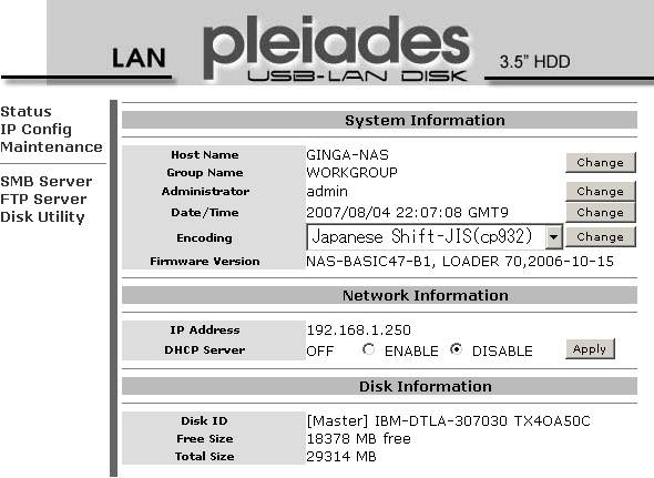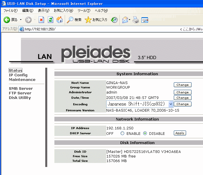 SubnetMask と Gateway はそのままコンソールの表示値を入力します。Primary DNS は通常 Default Gateway と同じになります。 Apply ボタンを押します。 ![]() 7.一旦 Internet Explorer を閉じ、LANDISKの電源を落としてLANケーブルを外して PCのLANケーブルは元の状態に(ルーターに接続)戻します。LANDISK のケーブルもルーターに接続します。 8.再び LANDISKの電源を入れ Internet Explorerを立ち上げて URLに「 http://aaa.bbb.ccc.ddd 」(ddd は6.で入力した4桁目の値)と入力すると設定画面が表示されます。 参考までに、使用したHDDは Hitachi HDS722516VLAT80 です。 2007/08/05 追記: 掲示板に picasa さんとおっしゃる方から、V-GearのファームのURLを問い合わせ頂いた。 正直、ちょっと焦ったんだが、ファームやドライバの類はかなり几帳面にHDDに保存していると自負していたんだが、・・・・ない。 唯一、会社とのデータコピーに使っている USBドライブに NAS BASIC46.BIN というそれらしいファイルがあった。しかし、これが絶対に 私がアップグレードしたファームだという証拠も自信もない。一応、http://www.station-drivers.com/page/landisk.htm からVer.46 の MacPowerというファイルを落としてきて、解凍してUSBドライブの中にあったファイルと照合したら一致したので、たぶんこれに違いないだろうとは思ったが、人に「そうです」と言うのはちょっと憚られる。そこで、その上にあった Ver.47 の中の V-Gear用の V47-B2 + bootloader 0.69 というのを落としてきて、アップグレードしてみた。 つつがなくアップグレードできて、今のところ問題なく動いている。IPアドレスなどの設定もリセットされるかと思っていたが、引き継がれたようだ。 ![]() ファームウェアのバージョンも上の通り 47-B1 となった。 2008/07/19 追記 その2: 最近気づいたんだが、インターネットからドライバのアップデートをダウンロードした場合に、時々(いつもではない)同名ファイルが2つ出来てしまう。片方はファイルサイズが 0バイトなので、多分HDDの FAT領域以外の容量を圧迫していることは無いと思うのだが、どうも気になっていた。 ![]() うるさいからと思って、0バイトのほうのファイルを削除すると、反対のファイルが消えてしまう。結局どちらのファイルも消せない。 少なくとも 1年位前までは気づかなかったので、ファームのせいかも知れないと思って暫くぶりに上記のページを見ると MacPower用 Ver.48 B6 というファームがアップされている。これをダウンロードして、アップグレードしてみた。2つほどファイルをダウンロードしてみたが、今のところ正常に見える。もう少し使ってみてレポートしよう。 |