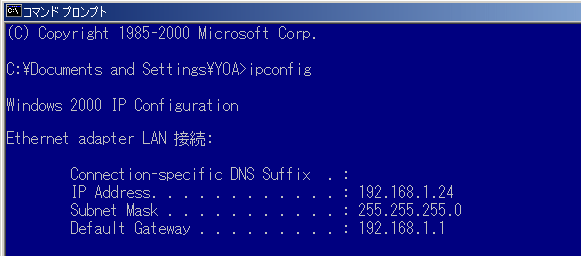 3.PCでコンソールを立ち上げ >ipconfig と入力してリターンキーを押します。![]() 表示される情報のうち、IP Address の値をメモします。 4.PCの Internet Explorerを立ち上げ、URLに 「 http://169.254.0.1 」と入力しリターンキーを押します。 IDとパスワードの入力画面が表示されるので、両方に 「admin」と入力します。