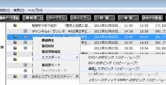 録画ファイルを カット等の編集をするには、mAgicガイド Digital のライブラリ画面で、編集してダビングする番組名の上で右クリックして、表示されるメニューから 「エクスポート」 > 「編集してダビング」 を選ぶ