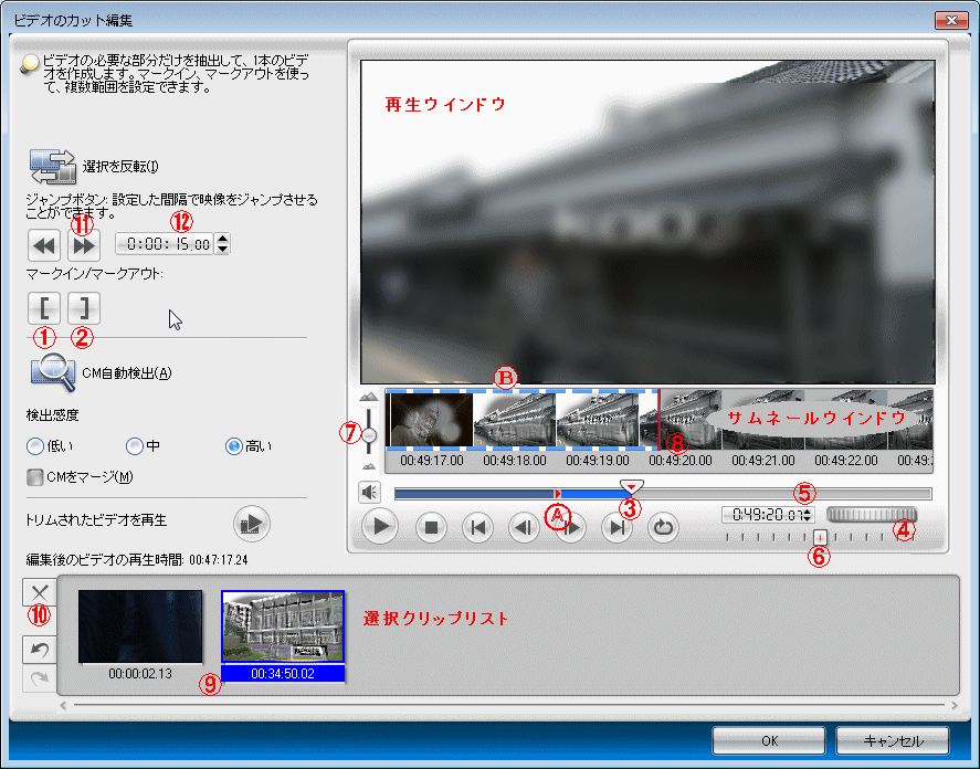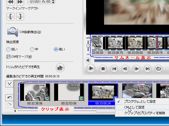 もし、CMとして検出した中に プログラム部分が含まれていたり、逆にプログラム部分に CMが含まれていたりした場合は、そのクリップを選択してサムネール表示させ、プログレスバーを操作して CMとプログラム部分の境目に選択位置を持って行き、そこでマークインかマークアウトを押す。クリップを選択した時点で、そのクリップの先頭フレームがマークイン位置、最終フレームがマークアウト位置となっているので、マークインを押した場合は選択位置よりも後ろがそのクリップの新しい範囲となり、マークアウトを押した場合は先頭からその位置までが新しいクリップ範囲となる。