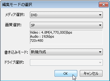 「編集モードの選択」というウィンドウが表示され、メディアが BD or DVD ・ 画質が XP/SP/LP(それぞれ 9.6/4.8/2.4Mbps) を初期に選ぶようになっている。画質やメディアの選択は編集画面でも変更できるが、画質は編集後の録画時間によって決める。XP: 1時間 SP: 2時間 LP: 4時間 が凡その目安。