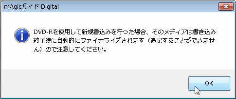 OKボタンを押すと、メディアはファイナライズされるという警告が出る。試してないが、2番組を同一 DVDに記録する場合は、編集で一本の番組につなげてから記録しないといけないのだろうか?