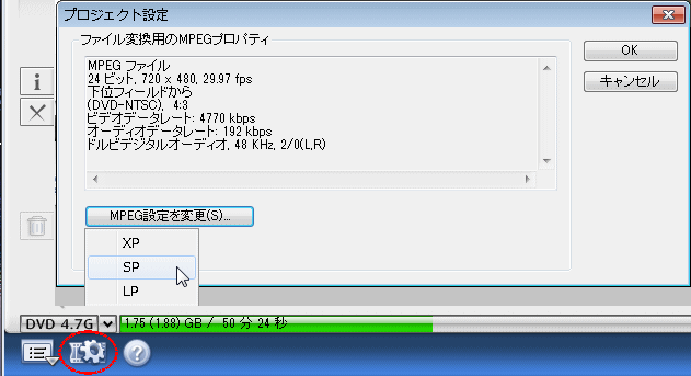 Direct DiscRecorder for mAgicTV が立ち上がる。処理後の容量が下に緑のバーで表示され、オーバーすると赤くなる。オーバーした場合は左下の「設定ボタンを押すとプロジェクト設定の変更が出来る。「MPEG設定を変更」ボタンを押すとXP/SP/LP が変更でき、下の容量の緑のバーの長さが変わり、1枚に記録できる容量を超えるとバーの色が黄色>赤に変わる。
