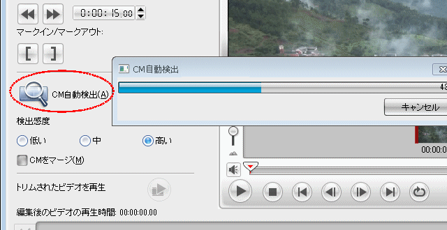 「CM自動検出」ボタンを押すと、自動検出が開始される。検出感度はその下のラジオボタンで「低い/中/高い」から選択する。
