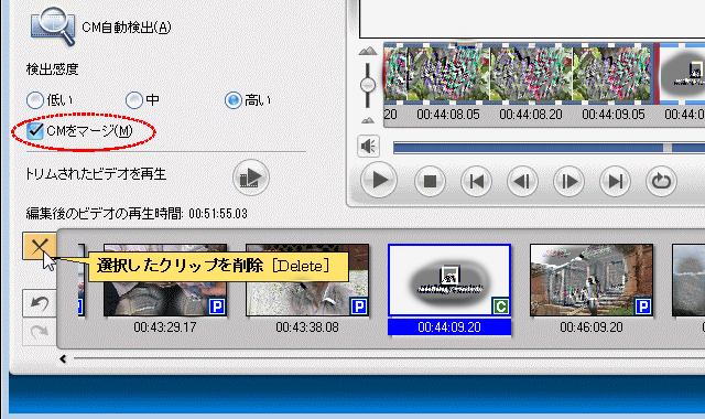検出された CMを確認し、間違いなければ 「CMをマージ」をチェックして CMをまとめ、CMのクリップを選択してから左側の 「X」タブを押して消す。