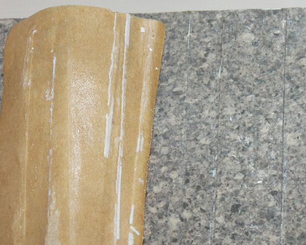 しばらく悩んだ甲斐あってか、本当に押し迫って大晦日の朝、ふとアイデアが浮かびました。固まりとは言ってもこすれば落ちるところもあるし、剥がれるときは石膏のように固まりで剥がれてくるので、引きはがす力がある程度あれば落ちるんではないか? と考えていたら、ガムテープの粘着力を思いつきました。ま、試す分には時間がかかりませんし、安いものです。なにより失敗しても変色や傷といった心配がありません。早速、あり合わせの紙ベースのガムテープを取り出して、10cmほどに切り取ってからバスルームの床の汚れの激しいところに貼り付け、爪で何回か良く擦りつけてからパリッと引きはがしてみました。