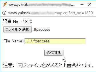 ð–éA‚±‚̃y[ƒW‚ðƒAƒbƒv‚µ‚Ä‚¢‚éƒT[ƒo[‚̃tƒ@ƒCƒ‹‚ð‚¿‚å‚Á‚Æ‚¾‚¯C³‚µ‚ăAƒbƒv‚µ‚悤‚Æ‚µ‚Ä‚¢‚éÅ’†‚ÉA‚‚¢uo—ˆSv‚Å—]•ª‚ȃtƒ@ƒCƒ‹‚ð‘€ì‚µ‚½“r’[ACGIƒvƒƒOƒ‰ƒ€‚̃tƒHƒ‹ƒ_[‚Ö‚Ì FTPƒAƒNƒZƒX‚ªo—ˆ‚È‚‚È‚Á‚Ä‚µ‚Ü‚Á‚½BƒT[ƒo[ã‚Ì .ftpaccess ‚Æ‚¢‚¤ FTPƒAƒNƒZƒX§ŒÀ‚ð IPƒAƒhƒŒƒX’PˆÊ‚Ås‚¤ƒtƒ@ƒCƒ‹‚ð‚¢‚¢‰ÁŒ¸‚É‘‚«Š·‚¦‚Ä‚µ‚Ü‚Á‚½‚悤‚ÅAŽ©•ªŽ©g‚Ì IPƒAƒhƒŒƒX‚ðŽó‚¯•t‚¯‚Ä‚‚ê‚È‚‚È‚Á‚Ä‚µ‚Ü‚Á‚½–Í—lB¡‚Ü‚Å‚Í FFFTP‚È‚Ç‚Ì FTPƒc[ƒ‹‚ł̓AƒNƒZƒX‚Å‚«‚È‚‚Ä‚àAHTTP(HTTPS?)ƒvƒƒgƒRƒ‹‚Å‘€ì‚Å‚«‚é Lolipop FTP‚È‚ç•\ަ‚³‚ꂽ‚̂ł»‚¿‚ç‚ÅC³‚·‚ê‚Ή½‚Æ‚©‚È‚Á‚½‚ñ‚¾‚ªA¡‰ñ‚Í Lolipop FTP‚Å‚à‰½ŒÌ‚©•\ަ‚³‚ê‚È‚‚È‚Á‚Ä‚µ‚Ü‚Á‚½BC³‚µ‚½i‚Å‚ ‚낤j .ftpaccess ƒtƒ@ƒCƒ‹”z‰º‚̃tƒHƒ‹ƒ_[‚ªŒ©‚©‚¯ãÁ‚¦‚Ä‚µ‚Ü‚Á‚½‚̂ł©‚È‚èÅ‚Á‚½‚ªA CGI‚ðŽÀs‚µ‚Ä‚Ý‚é‚Æ³í‚ÉŽÀs‚³‚ꂽ‚Ì‚ÅA‚Ç‚¤‚â‚çƒtƒHƒ‹ƒ_[‚ªíœ‚³‚ꂽ‚킯‚ł͂ȂAŒ»Ý‚Ì IPƒAƒhƒŒƒX‚©‚ç‚̓AƒNƒZƒX‹ÖŽ~ó‘ԂɂȂÁ‚Ä‚¢‚邾‚¯‚炵‚¢‚Æ”»’fB‚µ‚©‚µC³‚·‚é•û–@‚ª‚·‚®‚ɂ͕ª‚©‚炸Aň«ƒTƒ|[ƒg‚ɘA—‚µ‚Ä–â‘è‚Ì .ftpaccess ƒtƒ@ƒCƒ‹‚ð휂µ‚Ä‚à‚炤‚µ‚©‚È‚¢‚©‚ÆŠÏ”O‚µ‚½‚ªAð–é‚Í”æ‚ê‚Ä‚»‚̂܂ÜQ‚Ä‚µ‚Ü‚Á‚½B ¡’©‚ɂȂÁ‚ÄŽU•à‚µ‚È‚ª‚çƒcƒ‰ƒcƒ‰l‚¦‚邯A‚©‚È‚èƒLƒƒhƒC•û–@‚È‚ª‚çˆê‚‚¾‚¯ô‚ªŽv‚¢•‚‚©‚ñ‚¾BŽÀ‚ÍAŽ„‚Ì‚±‚Ì‚…“ú‹L‚̃y[ƒW‚ð‹Lq‚·‚é CGIƒvƒƒOƒ‰ƒ€‚̈ꕔ‚É–{•¶’†‚É–„‚ßž‚މ摜ƒtƒ@ƒCƒ‹‚ðƒAƒbƒv‚·‚邽‚ß‚ÉAê—p‚̃tƒ@ƒCƒ‹ƒAƒbƒvƒ[ƒ_[‚ª‘g‚Ýž‚ñ‚Å‚ ‚é‚ñ‚¾‚ªA‹L‰¯‚ł͉摜ƒtƒ@ƒCƒ‹‚à JPG‚â PNG‚ɑΉž‚·‚邽‚߃tƒ@ƒCƒ‹‚ÌŽí—Þ‚ÍŒÀ’肵‚Ä‚¢‚È‚©‚Á‚½ƒnƒYB‚±‚̃tƒ@ƒCƒ‹ƒAƒbƒvƒ[ƒhƒvƒƒgƒRƒ‹‚Í HTTPƒvƒƒgƒRƒ‹‚Ȃ̂ÅAFTP‚̃AƒNƒZƒX§ŒÀ‚ɂ͈ø‚Á‚©‚©‚ç‚È‚¢‚ÆŽv‚í‚ê‚éB‚±‚±‚ÅV‚µ‚¢ .ftpaccess ƒtƒ@ƒCƒ‹‚ðŽw’肵‚ăAƒbƒv‚·‚éæ‚ÌƒtƒHƒ‹ƒ_[ƒpƒX‚ð–â‘è‚̃tƒHƒ‹ƒ_[ƒpƒX‚ÉŽw’肵‚Ä‚â‚ê‚ÎAãŽè‚s‚¯‚Î ‘‚«Š·‚¦‚ç‚ê‚é‚̂łÍH@‚Æ”¼M”¼‹^‚È‚ª‚çˆêã~‚Ì–]‚Ý‚ª¶‚܂ꂽB‘‘¬‹A‚Á‚Ä‚«‚ÄAV‚µ‚¢ .ftpaccess ƒtƒ@ƒCƒ‹‚ð쬂µƒAƒbƒv‚µ‚Ä‚Ý‚é‚ÆA‚¨‚§I@FTP‚ŃtƒHƒ‹ƒ_[‚ª•\ަ‚³‚ꂽ‚ł͂Ȃ¢‚©I@‚Ü‚³‚©‚±‚ñ‚ÈŽg‚¢•û‚ª‚Å‚«‚邯‚ÍA“]‚Î‚Êæ‚ÌñEEE‚ÆŒ¾‚¤‚æ‚èu“]‚ñ‚Å‚©‚ç’T‚µ‚½ñvB‚¢‚Â‚à‚±‚ñ‚È‚ÉãŽè‚s‚‚킯‚È‚¢‚Ì‚ÉA‚‚¢’²Žq‚Éæ‚Á‚Ä‚µ‚Ü‚¤ˆ«‚¢«Ši‚¾B i‚Æ@‚±‚ñ‚È‚±‚Ƃ𑂂ÆAƒnƒbƒJ[‚Éd—v‚ȃtƒ@ƒCƒ‹‚ð‘‚«Š·‚¦‚ç‚ê‚Ä“¥‚Ý‘ä‚É‚³‚ê‚Ä‚µ‚Ü‚¤‰Â”\«‚à‚ ‚éB‚à‚¤‚Q“x‚Æ‚±‚ñ‚ÈŽè‚ðŽg‚¤Ž–‘Ô‚Í—ˆ‚È‚¢‚¾‚낤‚ÆAQ‚ĂĊY“–ƒvƒƒOƒ‰ƒ€‚ɂ͉摜ƒtƒ@ƒCƒ‹‚ðƒ`ƒFƒbƒN‚·‚郋[ƒ`ƒ“‚ð’ljÁ‚µ‚½Bj ¡“ú‚ÌŽÊ^‚ÍA‰½‚Æ‚à‚¤ŠJ‰Ô‚µ‚½‰Í’Ã÷BŽU•à“¹‚É‚P‚O–{‹ß‚‚ ‚é‰Í’Ã÷‚Ì‚¤‚¿‚PTŠÔ‚Ù‚Ç‘O‚©‚ç‰Ô‰è‚ªƒsƒ“ƒNF‚ð‘ттĂ«‚½‚̂Œ–Ú‚µ‚Ä‚¢‚½‰Ô‰è‚ªAˆê—Ö‚¾‚¯‚È‚ª‚炵‚Á‚©‚è‚Æ‰Ô•Ù‚ÍŠJ‚¢‚Ä‚¢‚½B¡“ú‚ÉŒÀ‚Á‚Ä‚¢‚‚à‚̃Jƒƒ‰‚ÍŽŽQ‚µ‚È‚©‚Á‚½‚ªA•à”ƒ`ƒFƒbƒN—p‚É–º‚©‚ç–á‚Á‚½ iPhone‚ªƒ|ƒPƒbƒg‚É“ü‚Á‚Ä‚¢‚é‚Ì‚ðŽv‚¢o‚µ‚ÄAŽv‚¢Ø‚è”wL‚Ñ‚µ‚ă}ƒNƒŽB‰e‚µ‚Ă݂½B |