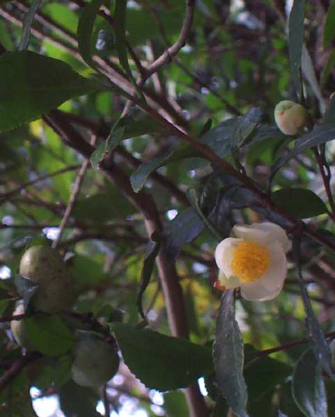 昨日の日曜日に山道の散歩にでました。 崖の雑木の中にお茶の木が一本混じっていて、丁度花をつけていました。そう、あの飲む「お茶」の葉っぱを取る木に花が咲くんです。お茶の花って今ごろ咲いていたんですね。そう考えていると、お茶の葉っぱは椿なんかの葉っぱと似てますし、花も似てます。同じ科だったかな? どちらも晩秋から初冬に咲く花ですし。後から調べて分かったらまた報告します。