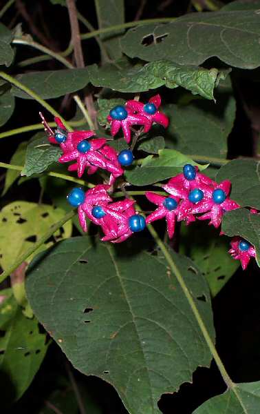 昨日と同じく、山道の散歩に出かけた際に撮影しました。 2週間ほど前に白い花が咲いていた木に、実がついていました。木は2mくらいの高さの潅木で、手のひらの大きさくらいの写真のような葉っぱにルビーのような色のとてもきれいな色をした直径が 7mmくらいの小さな実が付いていますが、ちょっと色が綺麗過ぎて 「毒があるかな?」と思わせる実です。ちょっとWebで調べましたが、見つかりませんでした。この木の名前を知っている方は是非情報を下さい。