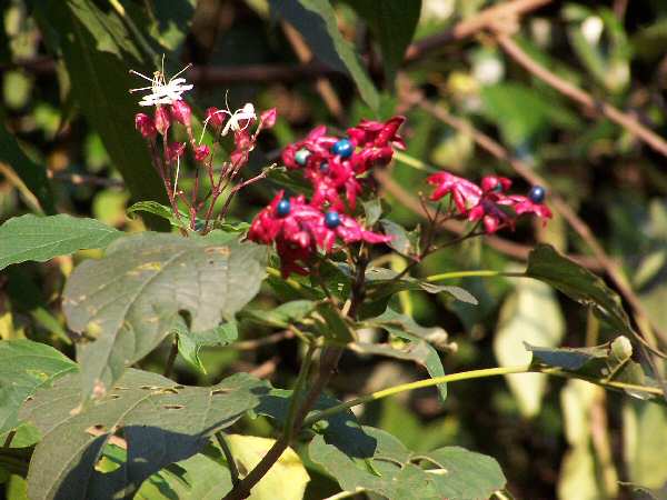 先日、21日に何の実? と書き込んだ極彩色の実の木の名前が大体わかりました。 Webで調べた結果、 http://www.mito.ne.jp/~minori/seibutu/seibutu12/seibutu12.htm などから、「クマツヅラ科のクサギ」らしいことが分かりました。 開花からの時間によって「しべ」の雄雌の役割が変わる雌雄異熟性という珍しい特徴があるようですが、納得いかないのはどの説明にも、近寄っただけで異臭がするくらい「臭い木」が名前の由来だそうです。確認のために今日も出かけてみましたが、しかし葉っぱをこすっても、実を採ってみても殆ど匂いはしません。季節によって匂いが変わるのでしょうか? 実は草木染めの原料にもなるようですが、 http://www8.ocn.ne.jp/~ama-web/merumaga_2.htm には、面白い話が載っていました。 Web上をあちこち探しましたが、花と実が同一のカットになっているものはありませんでした。高いところにあったので、10倍ズームの望遠側ぎりぎりで撮影したところ、深度が不足して花にピントを合わせると実の方はボケてしまいますが、必死でブレを抑えて撮ってきましたので掲載します。