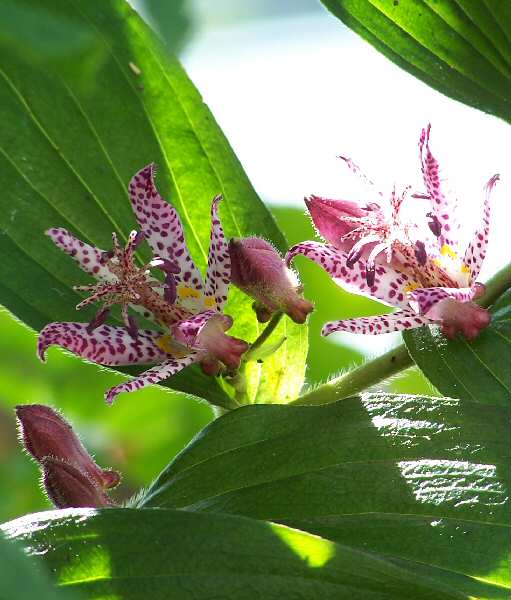 「ホトトギス」と言っても、鳥ではありません。 その名前が、鳥のホトトギスに由来していると言うものの、鳥ではなく花です。花びらの斑点模様が鳥のホトトギスの胸元の模様に似ているということから、ユリ科のこの花の名前が付いたとか。 でも私には、この際だった模様とその派手な形が非常に毒々しく見えて、上を向いて咲いている様はまるで食虫植物が花に寄ってくる虫を待っているように見えてなりません。我が家の手入れの行き届かない庭に一生懸命咲いている、何の罪も無い花のことをそんな風に言うのは可哀想かも知れませんが。 花に似合わず薄暗く湿った木陰に咲いているのも、そんな感じを抱かせるのかもしれません。この写真は、その日陰の花にちょっと無理を言って、午後の日差しが当たるように頭をもたげてもらって、葉の緑が逆光になる角度で撮影しました。湿った暗い感じはありませんよね。