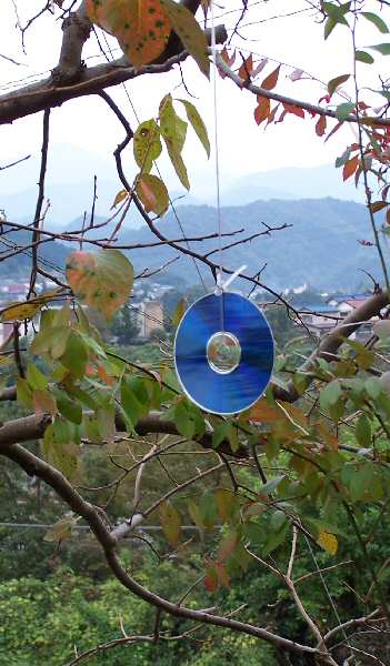 柿の葉が落ちて、変なものが露出しました。 鳥脅しの、CDです。 鳥は、光るものと丸いものが嫌いと言うことで、近年 不要になったCDをぶら下げることがはやっています。ブルーベリーの実が鳥に食べられてしまうのを防ぐために下げましたが、実際にかなり効果があります。鳥害に困っている方はお試し下さい。 多分頭が良いカラスには効かないかも知れませんが。