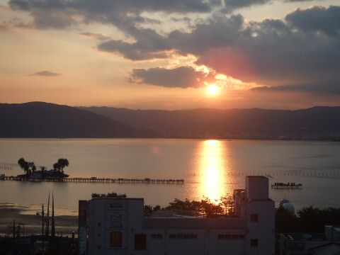 金曜日(1日)から、家族で諏訪方面に旅行しており、書き込みが出来なかったので、まとめて記入します。 我が家の女性は雨女が多く、移動するときは必ずと言っていいくらい雨が降る。さて出かけようと玄関に出ると、途端に降ってくることや、出迎えに行って電車がホームに入ってくる時に同時に雷雨を連れてくることも良くある。でも到着してしまうと、しばらくしてやむことも多い。 1日も例に漏れず朝から雨だったが、上諏訪に到着して蕎麦を食べて、あちこち歩いていると雨はやんだ。 旅館に到着して、早めに展望露天風呂に入ると、目の前いっぱいに雨上がりの澄んだ空気に夕焼けが広がっている。湖に夕焼けが映って絶景。昔、諏訪湖近くの展望レストランから夕焼けを見ながらお茶を飲んだことがあったが、この景色を見ながらの風呂は嬉しくなってしまった。しかも、他には誰もいなかったので独り占め。一人ではもったいないくらいの景色。 慌てて部屋に戻って、家族(全員女性)に薦めておいて、カメラを取ってきて記念撮影。 男湯でもさすがに他の人が入っていたらカメラを持って入浴するのは憚られるが、一人ならお咎めなし。高い階に風呂があるホテルも多いが、いくら景色が良くともガラス越しだとガラスが湯気で曇ったり露結したりで写真は難しい。ところがここは露天風呂なので、素通しに撮影できる最高のシチュエーションだった。