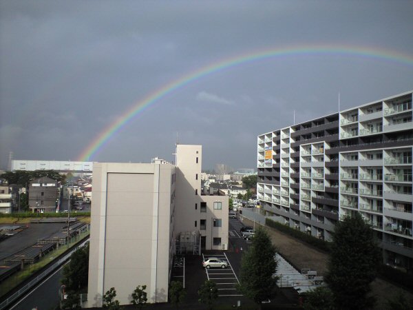昨日の朝、7時過ぎにふと気づくと窓の外にくっきりと虹が見えた。今まで見たことがないくらいに、完全な半円形の虹でびっくりした。若干は新しく隣に出来たマンションの陰に隠れているんだが、それでもかなり鮮明だ。驚いたのは左側の下の方を見ていったら、ぼんやりとではあるが、わずか 50m ほど離れた東京電力の資材置き場の地面から虹が立っているのが見えた。 虹の根本には宝が埋まっているとか、夢のある話を子供の頃は聞いた気がするが、今になってみれば虹は太陽と目の位置によって変化することが分かってしまっているので、そこまで行ってみようという気にはならないが(そこまで行ったら、今度はその先に虹が移動してしまう)、こんなに珍しい現象を見ることはそうはなさそうなので、記念に写真撮影しておいた。写真でも、よーく見ると地面の色が少し変わっているのが見えると思う。