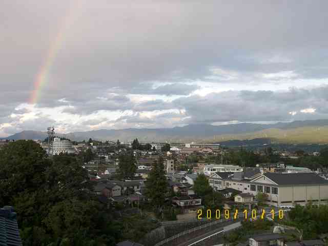一昨日の 10日、中学校の同級会ということで帰飯した。同級会の類は今年すでに3回目! 一昨年まで10数年、全くなかった(訳ではなく、糸の切れた凧で連絡がつかなかった事が大きいが)のに、還暦と言うのは正しく昔に戻るものなんだろう。 昨年の9月に同じクラスの同級会があり、出席した時には同級生のあまりの変わり様(!)にびっくりして、正直溶け込めない感じすらしたが、2年連続で出席の顔ぶれもそうは変わらないとなると、会話が弾んで(かなりの部分、去年の繰り返しだとは思うが)一層楽しかった。 何と宿泊した旅館の部屋は先生と同室!で夜中の2時まで話し込み、翌日は去年のハプニング(No323)の再来?!と続き、またまた非常にインパクトの強い非日常体験の連続で疲れたが、リフレッシュも出来た。 2泊したこともあり、2日目には昔 就職で上京した時、同じ電車で上京した同窓生のやっているトンカツ屋で昼飯を食べた。意外に?おしゃれな店でびっくり。 彼が上京して、日本橋のトンカツ屋に丁稚奉公した時、職場が近かったのでもう一人の友人と訪ねたとき、「俺はまだ肉には触らせてもらえないが、このキャベツは俺が刻んだんだ。食ってくれ」と言われて、包丁で本当に糸のように細く刻んだ柔らかいキャベツを2度お代わりして食べたことを懐かしく思い出した。そう言えば、あの時以来あれよりおいしいキャベツは食べた覚えがない。 そんなことを思い出しながら、同級会で疲れた胃袋にトンカツ定食という結構重い昼飯をとり、丁度秋休みで同じく帰飯した姉・姪と一緒に墓参りに。 次はいつ同級会だろう? 写真は、宿に着き、さて温泉に入ろうかと思って南アルプスの方を眺めると、どこかで雨が降ったのか東の空に虹が! 思わずシャッターを切った。