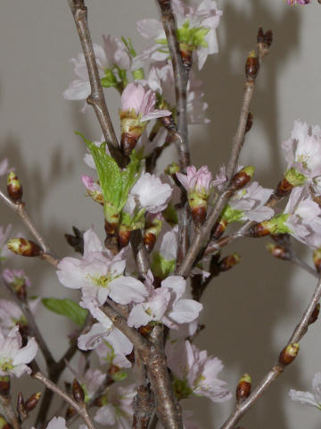 年が明けても寒い日が続いている。一応朝のうちはそこそこ日差しもあるが、午後になると曇るか薄日になって気温が上がらない。そんな中、暖房した部屋の温度は 20℃程度なので、去年の年末に頂いた 「みちのく初桜」という桜の枝が新年になって花開いた(写真)。日本人としては 新年早々に桜の花が見れるというのは何か別世界のようで非常に嬉しい。ほとんど白い花びらから先端の淡いピンクに向かうグラデーションと緑の若葉や花芯の黄緑色との絶妙なコントラストは他の花木にはない清々しさを感じさせてくれる。