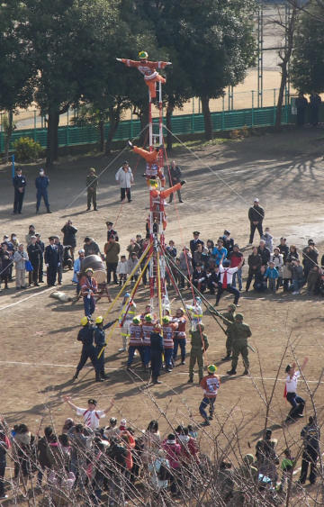 今日は目の前の中学校の校庭で出初式。しばし特等観覧席からの見物をした。 毎年放水のデモなどが行われるが、今年のフィナーレは「はしご乗り」。制服から察するに、座間市の職業消防士だけでなく、地域消防団や米軍座間キャンプの消防隊員、警察などの隊員がはしごを支える中、3人の消防隊員がはしごの上で演技している。どうやら「皆が協力して地域の安全を支えよう」というようなことを表現しているらしい。 今年はその他、女子マーチングバンドの行進などもあってなかなか華やかな「見せる」出初式だった。 一句: 出初式 終わりし後の 風寒し ・・・ところが、「寒し」は冬の季語で季語重なりだそうだ。でも有名人の俳句にも「神無月・・・ 風寒し」のような句があるようだからいいことにしよう。どうせ自己満足だし。