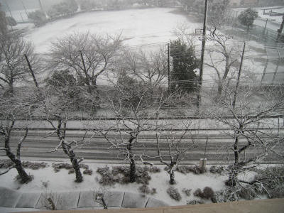 今日は夜明け前からの雨が早朝に雪に変わり、かなり激しい降りで瞬く間に目の前の風景が雪景色。本州南海上を低気圧が通り、そこに向かって北の冷たい空気が吹き込んでいるためらしい。 小正月の初雪にしては珍しく激しい降り方の雪だ。 ぬくぬくした部屋から窓の外を眺めつつ、昨日の出初式に降らなくてよかったけど、今日は成人式もありそうだから新成人は大変なんだろなぁとか、どちらも近年の我が家に関係者はいないので他人事に思っている。 写真は 正午頃に撮影。道路も既にシャーベット状になっている。