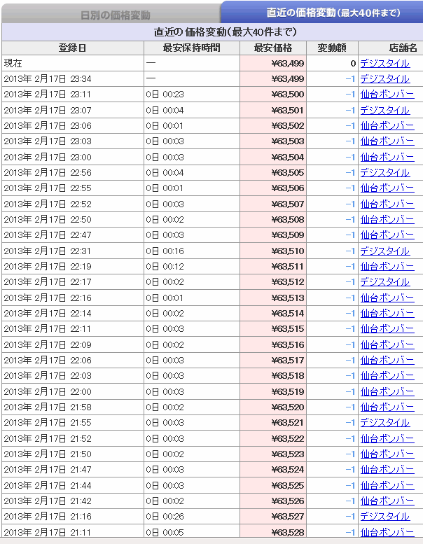 寒いせいでウメの開花が遅いと書いたが、今日はまた一本咲きはじめた木を見つけた。これも民家の塀の中で家人がいた関係で写真は撮らなかった。遅いながらもこうして徐々に一本ずつ咲いていくんだろう。 今日の朝日新聞の天声人語には「探梅」はこの時期に相応しいが俳句の季語としては冬で、節分までしか使えないと書かれていた。今使うなら「観梅」としないといけないらしいが、俳人とは何とまぁ一人よがりで不自由な人たちかと思ってしまう。17文字の組み合わせしかない「作品」ではそんな理不尽な作法で雁字がらめにしないと権威づけできないということだろうか。 さて、そんなことはどうでもいいが、昨日の続きで 価格.comの価格推移に注目したら 商品の購入よりも価格推移の現象が面白くなってしまって、ついついそのページを更新しながら見入ってしまう。 どうやら、2~3店舗が 数分間隔で 1円ずつ下げているらしい。価格推移のページを探したら、直近の最低価格を出した店と時間、その価格が表示されるタブがあった。どうやら「*ボンバー」という店はロボットで約 3分おきに 1円ずつ下げるような操作をしており、その他の店は不定期にそれを下回る額を時々入れているのでコチラは人為的に入力しているのではないか、そして夜中の 11時過ぎには「*ボンバー」がロボットを止めて、その後 一定時間してから別の店がそれを潜る価格を提示しておいてこの競争が一旦「休戦」に入るらしい、そして再び翌朝 9時前後に再開する・・・・等など舞台裏を想像できて買い物よりもむしろ楽しい。まとめ発注した商品を、なるべく利幅を稼ぎながらも売り残さないような駆け引きが目の前で展開されている。生鮮食品のセリや証券売買の様相だ。価格.com もその辺りの売り手側、買い手側の心理をついた仕掛けで漁夫の利を稼いでいる訳で、ここが一番ずる賢い。 価格差といってもトップから数店は数円しか違わないが、やっぱり1番目に表示されると目立つからクリックされる=注文に結びつく確率が高いんだろうなぁ。故障時の保証内容など、千円以下の違いだったらもっと吟味する項目もあるような気がするが、所詮地震と一緒で、運不運のほうが大きいから起きる前に考えても仕方ないと思っているんだろうか。 お目当ての機種は、この数日間値下がりが激しくなってきており、毎日 400円程度下落しているようだ。意中の店の在庫の最後をどうやって見極めるか、結構スリルがある。