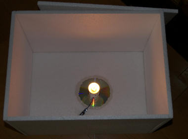 NotePCで遊んでいる間に、ちょっとご無沙汰していたモノづくりにチョコっと回帰した。 去年の秋に、ウレタンゴム樹脂材料を大量に購入して成形しようとしたんだが、折悪しく戸外は温度が下がって硬化がうまく行かなくなってしまった。そのうち電熱ヒーターの入った保温ボックスでも作ろうかと、見果てぬ夢を見たまま それも寒さを言い訳に延ばし延ばしになってしまっていた。 しかし、知り合いなどから成形品の注文が(それとなく言外にではあるが)あったので、そろそろ再開しないとマズいな、と思い立って まずは保温ボックスの方を作り始めた。 発泡スチロールの A3サイズの板を 6枚 いつもの百均で購入してきて、それを接着して箱状にして、その天井に 40Wのフラッドランプ型電球を取り付け、この電球を半波で点灯させるようにした。点灯させると写真のようにホンワリとした感じで光るので、多分赤外線は十分出ていると思われる。温度計を中に入れて測定すると底面は外気温+15℃くらいになるので何とか使えるだろうという判断。 しかし最後の最後で大失敗。買ってきた発泡スチロールは若干空気の出入りがありそうで、ペイントで塞げるかと手持ちの有機溶剤系のペイントを外側に塗ったら、何と発泡スチロールが溶けてブツブツ穴が開きそうになった。とりあえず使えてはいるが、ペイントを塗る前よりも却って保温性は低下していると思われるので、いずれ作りなおさないとならない。大昔、プラモデルに塗装しようとして、ラッカーを塗ったら地が溶けた部品があったのを思い出した。スチロール樹脂はシンナーで溶けるのをうっかり忘れていた。