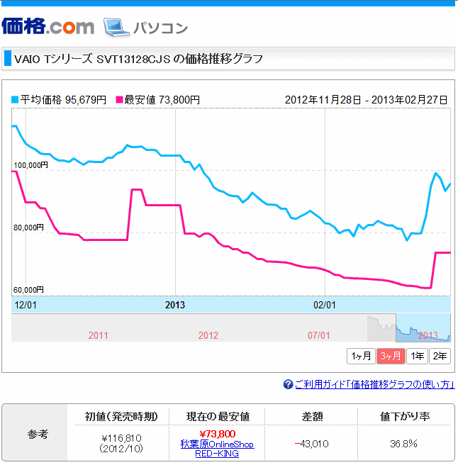 新しく依頼された仕事で、出かけて講義などをすることになったんだが、どう考えてもプレゼンテーションソフトを使うことになる。当初、プレゼンテーションを作るのは家のデスクトップ、作ったファイルをUSBメモリで持参して再生するのは先方のノートを借りる、という前提で考えたが今までの経験で、途中の電車の中で思いついたりしたことをその場で或いは先方についてから手を入れたくなることが多い。 考えてみれば、会社勤めを止めてから「ホームオフィス」を実践してきたので 5年近く自前のノートは使っていないことになる。それ以前から使っていた古い 2000年発売くらいの東芝製は 4年くらいまえに電源を入れてみたが起動せず、どうしてもという時は娘やヨメさんの 15.6inchのノートPCを借りていたが、それらももう古くてデスクトップ機に慣れてしまった今の私には画面や動作が気に入らない。何より、幅 38cm、3Kg近くと大きくて重いのでカバンに入らないから電車で移動は現実的じゃない。 等など、結局はヘリクツをつけてノートPCが欲しくなった。 最初、新聞広告でみるPCデポなどの情報で サイズやコストパーフォマンスから ASUSが出している iMac Airモドキの薄型Noteになるだろうと思っていたんだが、店頭で見るとそれらもどうもイマイチなので、改めて Webの 価格.comや量販店の Web販売サイトで 画面が 12-14インチで 2Kg以下という条件で物色してみた。 で、予想外にも Sonyの Vaio Tシリーズが浮上してきた。CPU i5 MS Officeプリインストールという条件で 2012年秋モデルが 6万円台半ばで入手可能。ヨドバシなどでは既に同じモデルは販売終了しているところを見ると、まもなく同等の新型に移行するための「タタキ」状態なんだろう、と想像。この日記でも 何度も「Sony製品は嫌い」と言っていたのに、F通やNECとのあまりのラインナップや C/Pの違いに宗旨変えを余儀なくされてしまった。まぁ、嫌いな理由の一つ、たくさんの余分なプリインストールアプリは購入直後、せっせとアンインストールするハメになりそうだが。 しかし、昨日見た記憶で Sonyのネット通販から直に「価格.com 限定モデル」として出ていた機種が、昨夜遅く見た時には既に消えていた。そして最初見た時には、同じスペックの通常モデルがそれより若干高かったのに、今日はそれらが昨日の限定モデルよりも300円ほど安くなっていて、しかも時々刻々 数円単位で下がっていく。Sony直販サイトは昨日で該当機種を売り切った&私が見たのは最後の在庫数台の情報ということだったのか? 全国の通販店が、価格.com 画面と首っ引きでリアルタイムで値下げ競争している様を想像すると、静止画面から緊迫感が伝わってきてなかなか面白い。 しかし、直販サイトは 3年間の通常保証込だし、一般の通販サイトは 5%程度の料金の上乗せで 5年保証など、保証条件まで考えるともう数日「待ち」という結論。 その間に 商品が「完売」で市場からなくならないことを祈っているんだが・・・・甘いかな?