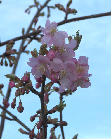 昨日は「梅が満開」と書いたが、啓蟄の今朝は散歩の桜並木道で開花した河津桜を見た。古くからの並木の老木はソメイヨシノだけだったかどうか知らないが、河津桜などの早咲きの桜は無かったと思うが、工事でいろいろな種類の桜の木を植えたようだ。暮れに見た十月桜もそのうちの一本だが、やはり桜はこの季節の濃くなった陽射しにに似合う花で、北風に花びらが震えるのを見てもあまり感激しない。 3月に入ったし、いよいよ いろいろな花が競って咲く季節が近づいたことを伺わせる。