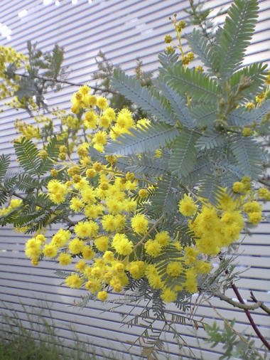 2~3日前に、気象庁が桜の開花宣言をしたのを聞いて「えっ! もう」と思った。 しかし、この辺りでも今朝はソメイヨシノの枝にチラホラ花がつきはじめた。何と、勝手に今年は寒かったし、ウメの開花も遅れたようだから桜も平年より遅いのでは、と思っていたのに、関東では観測史上最速だとか。駆け足どころか短距離走並だ。 まぁ、今日も大和まで自転車で出かけたが、2週間前にはダウンのコートでもいいかな?と思っていたのに、今日は薄手のセーターで十分なくらいの暑さだったから、この1週間ほどの気温からすれば開花しても当然なんだろうけど。 なんて話をしておきながら、今日の写真は桜じゃなくて恐縮だが、フサアカシアという木らしい。数日前にアップした銀葉アカシアと似ているが、どちらも花は黄色ながら、銀葉アカシアのほうが直径 2cmくらいもある大きな丸い球状で、フサアカシアの方は 1cmも無いくらいの小さなフサの集合のような感じ。葉は銀葉アカシアは硬くて短く、フサアカシアの葉は柔らかいらしい。