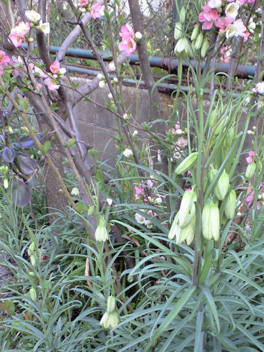 手前の釣鐘型の花は Webで調べるとスノーフレークという花らしい。バックのピンクの花は桃の花? 違う気もするがちょっと丸っこい可愛い花。