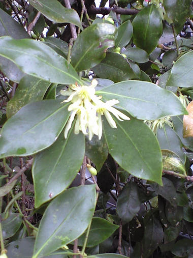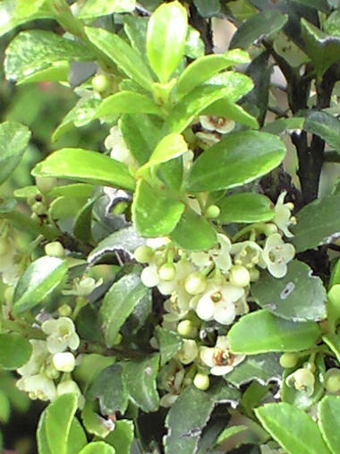 写真だけ。 2週間ほど前の撮影になるが、「ヒサカキ」という榊に似た木に花が咲いていた。遠くから見ると花が咲いているというより虫の糞か何かがくっついているようにしか見えない。近づくと一つ一つの花はお椀型で直径が 3mmほどと小さく可憐なんだけれど、集まると顎(がく)なんだろうか、花を覆っていた部分が落ちて汚い感じでけして綺麗とはいえない花。 | |