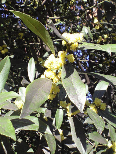 風邪を引いたり出かけたりしていて 2週間ほどジョギングをサボってしまった。3日ほど前には、時間はあったものの身体が重い感じでまだ走る気力が湧かなかった。 今日になって、やっと身体が軽く感じられて走る気になった。気温はちょうど走りやすい温度で走りはじめたが、さすがに 2週間も開くと身体が鈍って走り始めから疲れを感じてしまう。それでも途中からは何とか身体が思い出してくれたように動き出して、日課にしていたいつもの 3Kmを走り終えた。むしろ明日明後日が今日の疲れと重なって辛く感じられそうだが。 今日の写真は月桂樹?の花と思われる。花が咲かなければ榊か何かかと見過ごしてしまいそうな樹だが、3日ほど前から枝の先が黄色くなって花らしいものが咲いている。花は銀葉アカシア(#802)の花に似た黄色い集合花。 | |