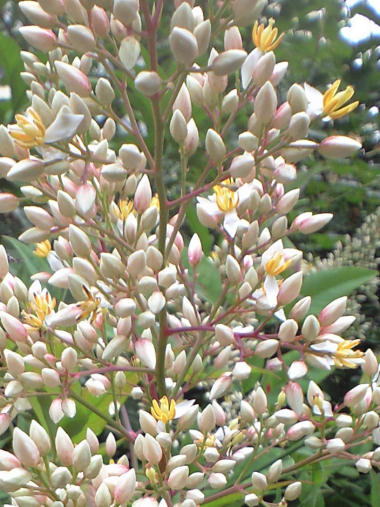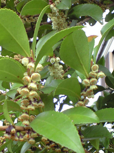 ここに、実の写真をアップした記憶があったが、これがその花。房の根元の方は既に緑色の実になっているようだ。 すでに 1mほどの高さに育っており、さらに高くなりそう。花は房状で、1つずつの花は 数mmしかないがトラノオ状にたくさん付いている。 | |
