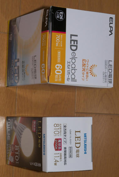 暫く花の写真が続いたので、中断して。 我が家は 9年前にここに引っ越した時、ほとんどの部屋の照明は白熱灯だった。しかし比較的最近の作りなので、照明はふんだんに設置されており夕方から夜中にかけて使われている照明用電力は合計で 400W前後もあった。引っ越して間もなく、自由業に転じたこともあって、節約志向+環境問題からその電球が切れる度に電球型蛍光管に切り替えてきた。しかし、蛍光管式の電球は点灯直後が暗いものが多く、家族からはすこぶる評判が悪かった。私は使用電力が 1/4~1/5程度になることを考えれば、点灯直後 1分程度の暗さは全く気にならなかったし、値段も寿命や電力を考慮すればリーズナブルだと思っていた。そしてすでに交換した蛍光管式電球の寿命も長いから、いずれ LED電球も蛍光管式のものに値段が近くなるだろうから、それまで待って切り替えようかと思っていた。 しかし連休で結婚した娘が帰ってきて照明の明るさでちょっとしたやり取りがあり、時期尚早と思いつつも、仕方なく昨日 LED電球を探して近くの家電店やホームセンターを 5店ハシゴした。結果わかったことは、売れ筋の 普通の電球タイプのものは 60Wタイプで 1,000円を切ってきたが、ダウン照明やボール型などの形が特殊なものはまだ 2,000円~4,000円程度するということと、根は同じだろうが特にボール型についてはまだまだ種類が少なく選択の余地が殆ど無い。値段は同じ照度なら使う LEDの数や種類は殆ど変わらないはずで、ちょっと高すぎるとは思ったが、仕方なしに 居間のメインの照明用 ボール型 4個と、玄関のダウンライト型 1個を購入。因みに上の方の ボール型 60W相当が 9Wで 2,480円(K's電気)、下の ダウンライト用が 11.4Wで 1,980円(ノジマ)。電球と比較すればいずれ電気代で回収できるとは言うものの、まだ使える蛍光管式と交換したことを考えると思わぬ出費だったが、取り替えた後の明るさは家族に好評だった。 しかし、今日になって価格comで調べると まだ価格comも電球型LEDについては表示の仕方がこなれていないというか、調べたい商品の比較がしづらい。例えばボール型で照度○○lm というようなカテゴリーで比較したいのに、口金口径と照度や配光角しか選択できないので見づらい事この上ない。まだまだ市場は宣伝ほどには LEDに移行していないんだろうか? | |