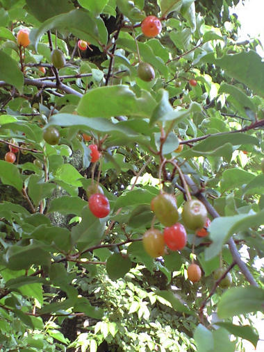 最初に開花したのはもう半月以上前の 5月下旬になるけれど、最近かなりな数の花が咲きはじめた。去年は 3個ほどしか実がつかず、口が割れた写真を撮ろうと思っていたが結局割れる前に誰かに取られてしまったのか、実がなくなってしまい果たせなかった。今年は花がたくさんついたので期待できそうだ。 | |