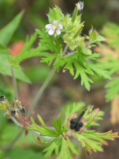 #864 の花の名前が判明した。 花が小さすぎてよく分からなかったが、今朝 もう一度よく観察して、花のあとに種子ができているのを写真に取り、花と種子で一致する花を探した。 結果、ヒメフウロ(或いはその仲間)だろうと判断。ヒメフウロも日本の固有種は県によっては絶滅危惧種=レッドリストに指定されているものもあるらしいが、こんな路端にビッシリ自生しているのはおそらく外来種か、品種改良された園芸種だろうと思う。 ゲンノショウコの仲間だと言うし、明日は種を採ってきて ベランダの鉢に蒔いておこうか。 写真は、撮り直したもの。この植物は紅葉が早く花が終わると同時に葉が赤くなるとのことで、その情報通りほとんどの葉は赤く枯れかかった色だったが、探したらまだ一輪だけ咲いていた。運良く花と種子を同じショットに収められた。手前の黒い塊が種子。 | |