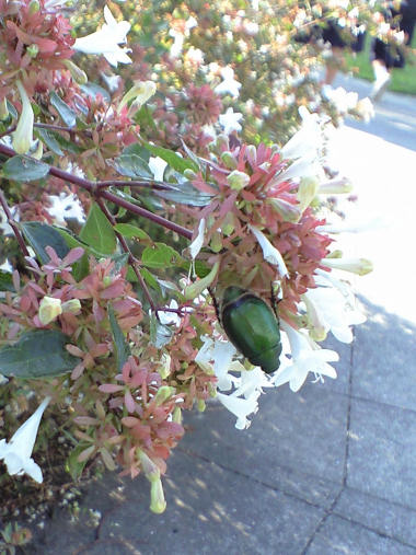 今日の写真は、アベリアの花の蜜を吸いに来た?コガネムシ。コガネムシは葉っぱを食害するとされているが、蜜も吸うんだろうか?