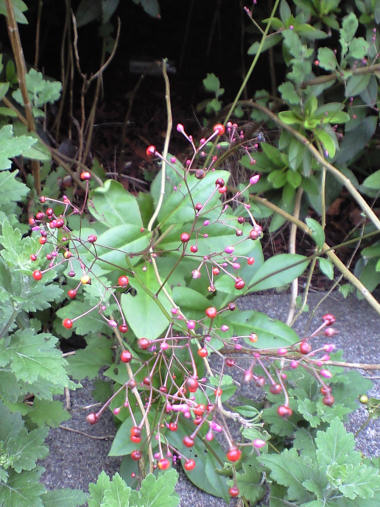 今日の写真は ハゼランの実? 線香花火の火の玉が飛び散ったように赤い実が1つずつ枝の先に成っている。