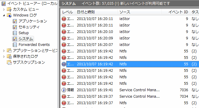 で、Windowsのイベントビューアを起動してエラーログを見ると 「iaStor」や「Ntfs」という ストレージ関係のエラーがズラーッと並んでいるではないか!!!