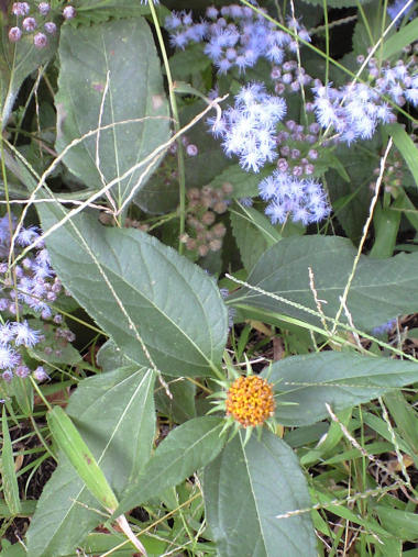 今日の写真は アゲラタムという菊のような薄紫色の花。下の方の黄色い花は??