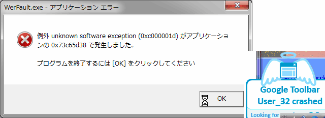 そんなことを考えながら、今日は再び SSDの方の O/Sを立ちあげて IEを使ってみようとしたら 今日は Explorerが最初からエラーで立ち上がらない。エラーは下図の通り Werfault.exeという警告表示か何かのエラーだが、Solutoさんは Google検索バーのアドオンの実行がクラッシュしたと教えてくれている。昨日より 2~3℃気温が下がったせいかな?Explorer 関連ファイル記憶域の近傍がどんどん潰れていくのが目に見えるようだ。