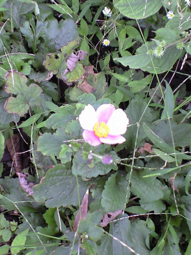 今日の写真は 名前を知らないが、散歩道の途中の花壇に咲いていた花。珍しく今頃咲いている。と思っていたら、今朝見ると 心無い人に根こそぎ取られてしまったようで、ぽっかり土に穴が開いてなくなっていた。(後日記入:シュウメイギクだろうか? よく知っている背がスッキリと高く白い花を付けるシュウメイギクとは草丈も花の色も違うが、Webで似た花を探したらそうらしい)