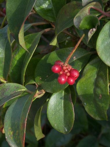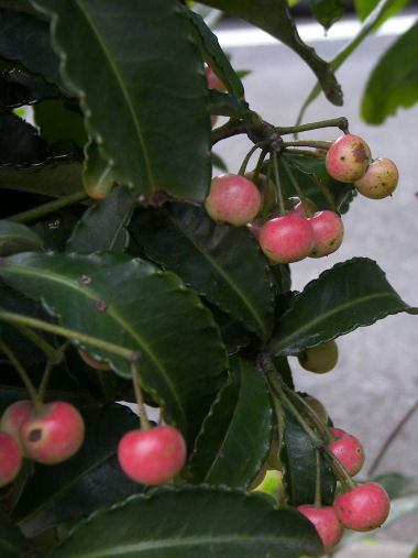 今日の写真は、名前を忘れたがクロガネモチとかカナメモチとかの仲間だろうか?1cm弱の実が赤く色づき始めた。