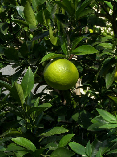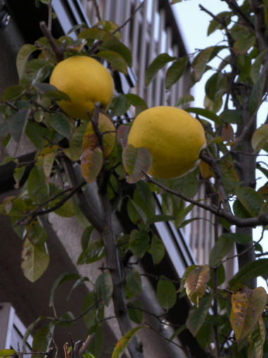 写真はマルメロ?の実。散歩途中の家の庭から顔をのぞかせている。最初は実の大きさから夏ミカン?にしては色づきが早いなぁと思って見上げていたが、どうも葉っぱも違う。色・形からするとマルメロだろうと思うんだけど自信はない。