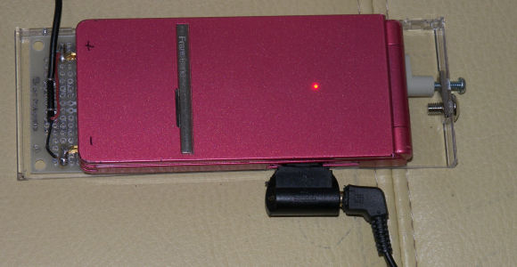 数台ある使わなくなった携帯電話を物色し、音楽再生が出来る機種を選んだ。しかし、携帯電話端末のイヤフォンジャックは特殊なコネクタで、充電端子も兼ねているので充電器と同時使用ができない。充電用クレードルがあればいいが、捨ててしまったのかどれもない。しばらくの間、夜の間はイヤホン用コネクタで、朝になったら充電用のコネクタを差し替えて使っていたが、暇を見て充電端子から充電できるように充電クレードルを手作りしてみようと思い立った。それが上の写真。底部の充電端子に、他の携帯電話を分解して取り出した電池切片をプリント基板にはんだ付けして、反対側からネジで押しつけるようにしてある。ネジで押しつけるよりは適当なバネで押しつける方がスマートだが、ちょうど良さそうなバネは手元になかった。携帯を立て置きして自重で切片に接触する構造も考えたが、イヤホンジャックのコードが出てくる方向の関係で、平置きの方が無難だと判断。その他、本体トレーは瞬間接着剤の使える材質という選択肢から CDの透明ケース蓋を切断して使用。ただ枕元に置いておくだけなので、外観は無視。機能はしている。