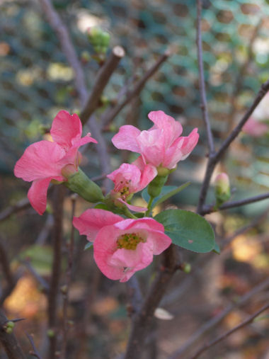 今日の写真は、最近になって木の名前が分かった花。 「寒木瓜(カンボケ)」 木瓜=真っ赤な花 と思っていたのですぐには分からなかったが、どうやら寒木瓜にはこうした ピンク系の花も結構あるらしい。11月末頃からチラホラ咲き始め、最近は花の数が増えてきた。殆ど花のない季節だけに、こんな可憐な花が咲いているとつい立ち止まって見入ってしまう。