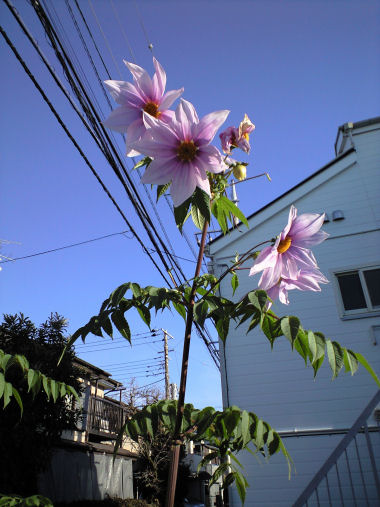 写真は、いつもの散歩コースを少し外れた駐車場の隅に咲いていた木立ダリア(皇帝ダリア)。2m以上もある花の高さで、見上げる姿勢になりどうしても空が入って逆光気味になってしまう。