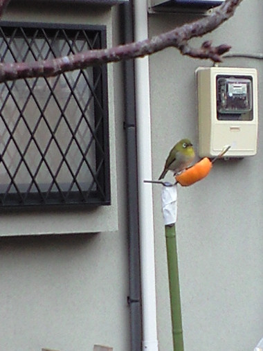 いつも散歩する時、道路わきの民家の庭に、ミカンを棒に刺して野鳥のえさにしている家がある。しかし、散歩で通り過ぎる限り、この実を食べに来ている鳥は見なかった。