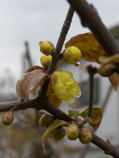 散歩途中のロウバイの木を見ると、まん丸なつぼみが大きくなっている。もしかして、と思って何時もの散歩コースから若干足を延ばして、別のロウバイの木を見に行った。