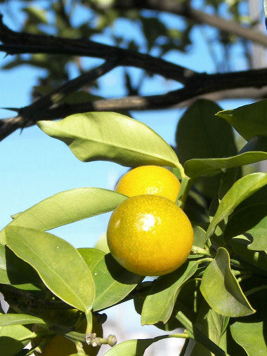 写真は、正月飾りにも使われるキンカンの実。朝日を受けて金色に輝いて青空に映えている。